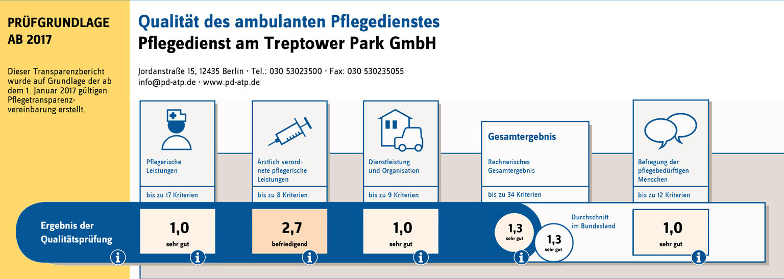 Der Pflegedienst am Treptower Park unterzieht sich freiwillig regelmäßigen Überprüfungen durch externe unabhängige Sachverständige. Dies geschieht jährlich durch den Medizinischen Dienst (MD) sowie alle zwei Jahre durch den Anbieter Verband qualitätsorientierter Gesundheitspflegeeinrichtungen e.V. (AVG). Ebenso regelmäßig schneidet unser Unternehmen mit sehr guten Bewertungen ab. Dies zeigt, dass unser gesamtes Team in der ambulanten Pflege unsere hoch gesteckten Ansprüche gleichermaßen teilt und mit großem Engagement in der täglichen Arbeit umsetzt.
